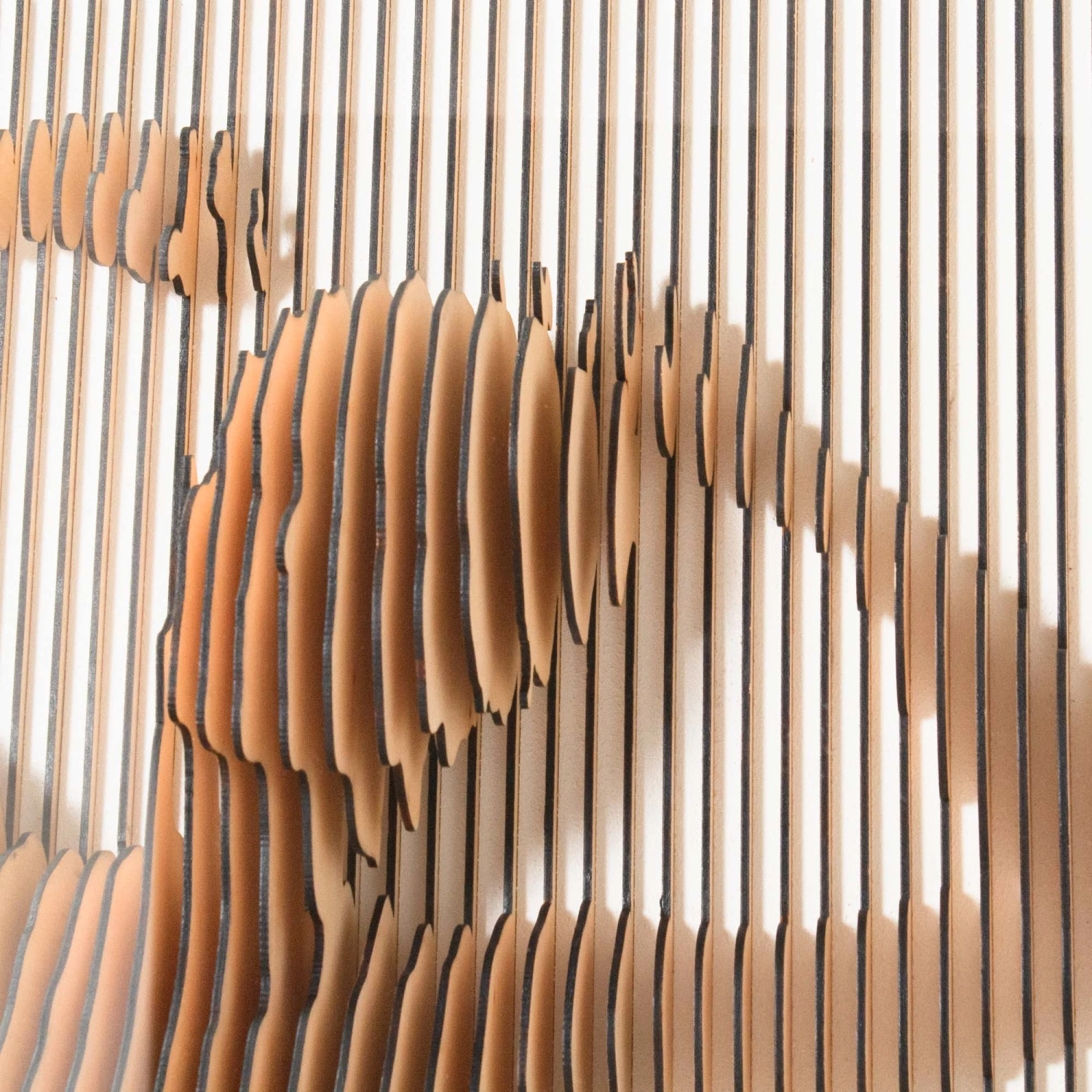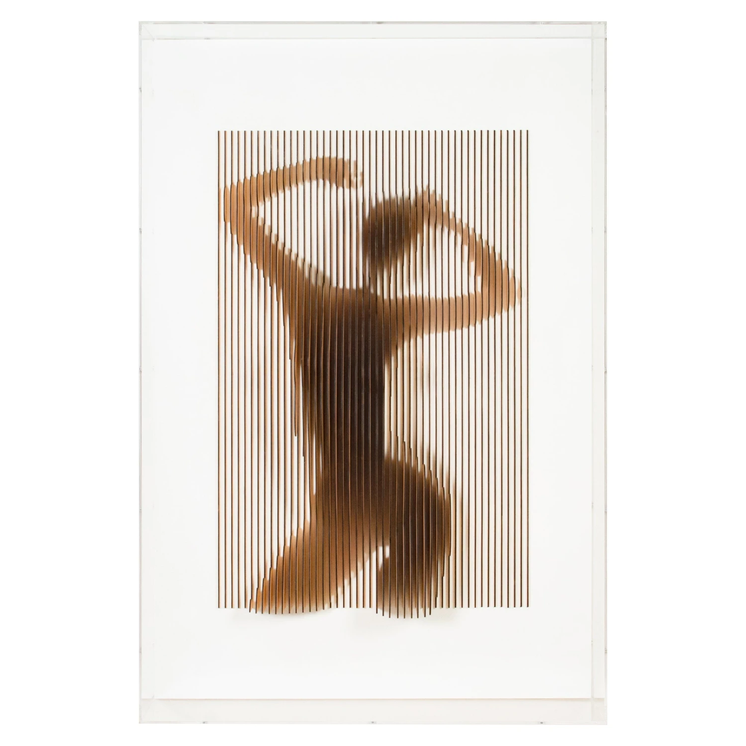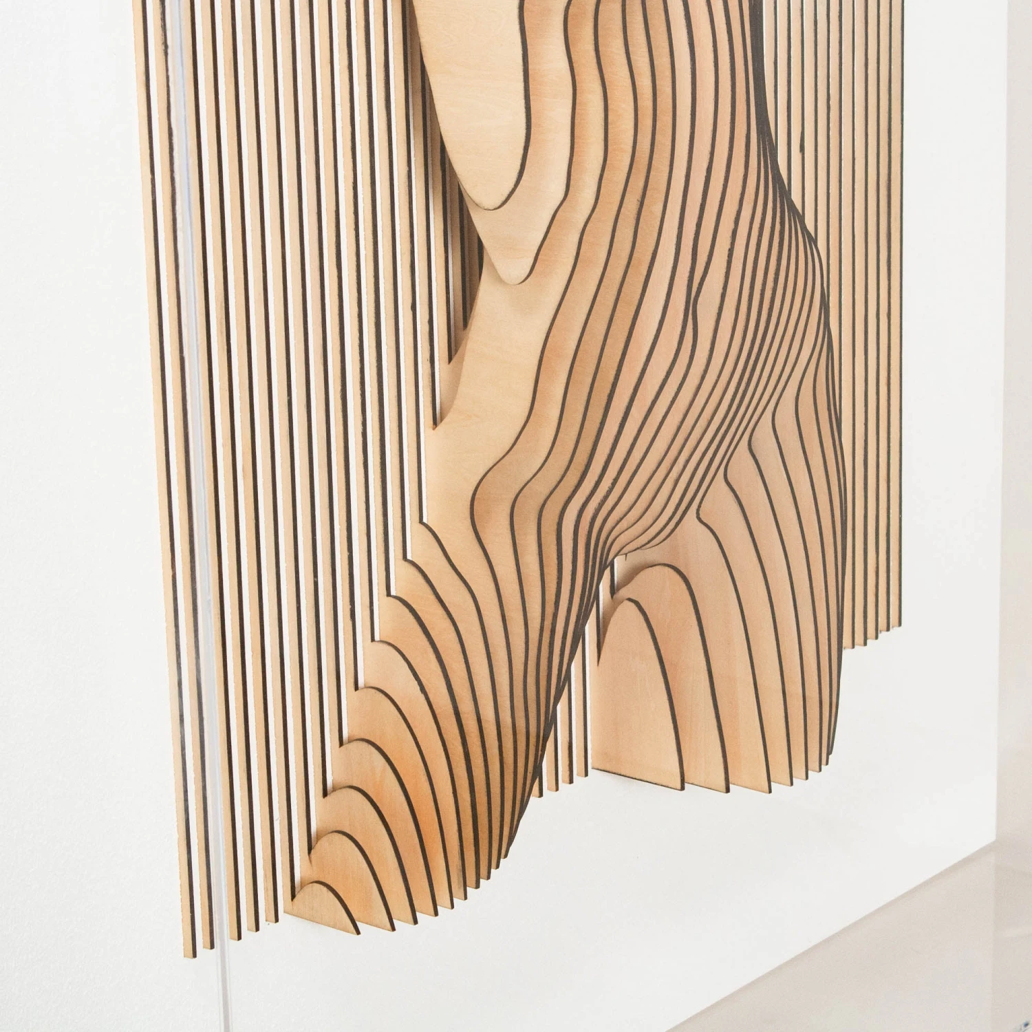 Mixed media artwork by Tat Frederick.ย Laser cut wood forms the body of a female with a stunning 3D effect.ย Mounted on white sandstone.