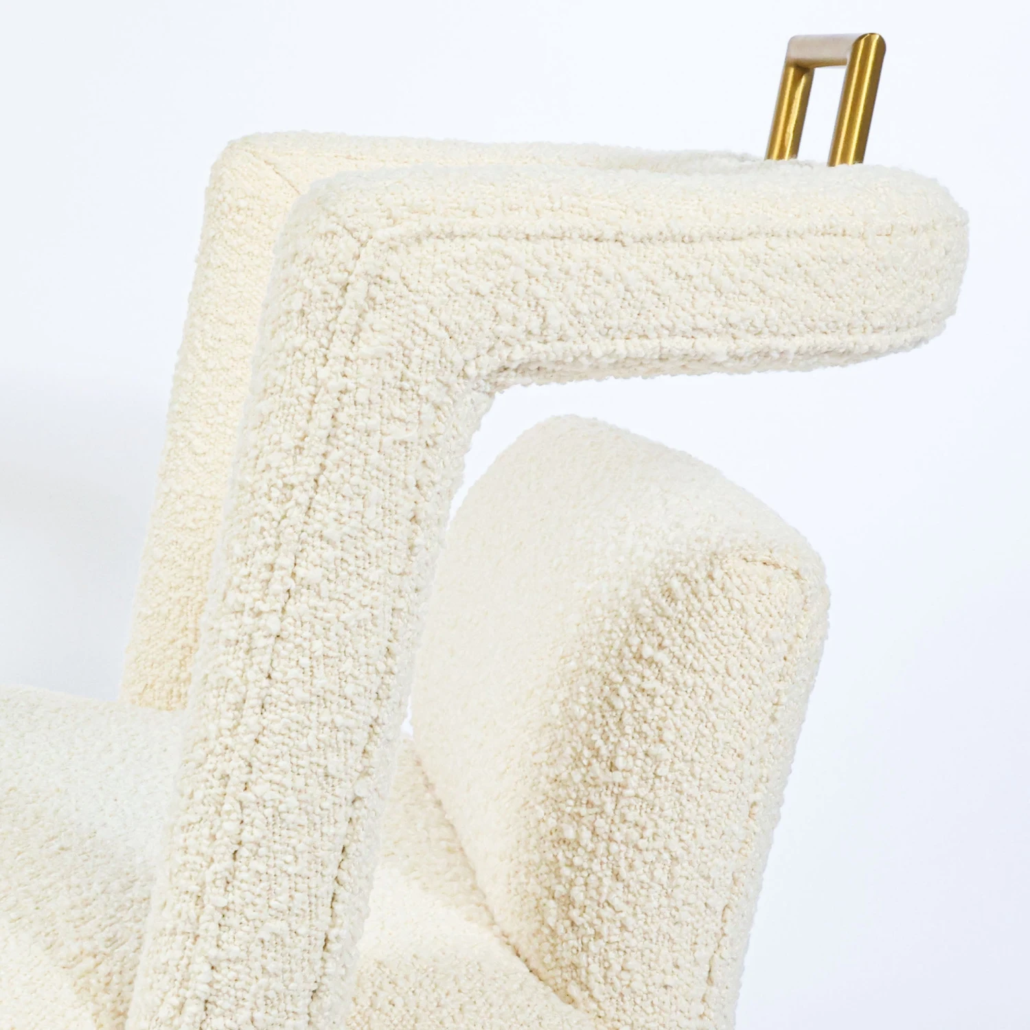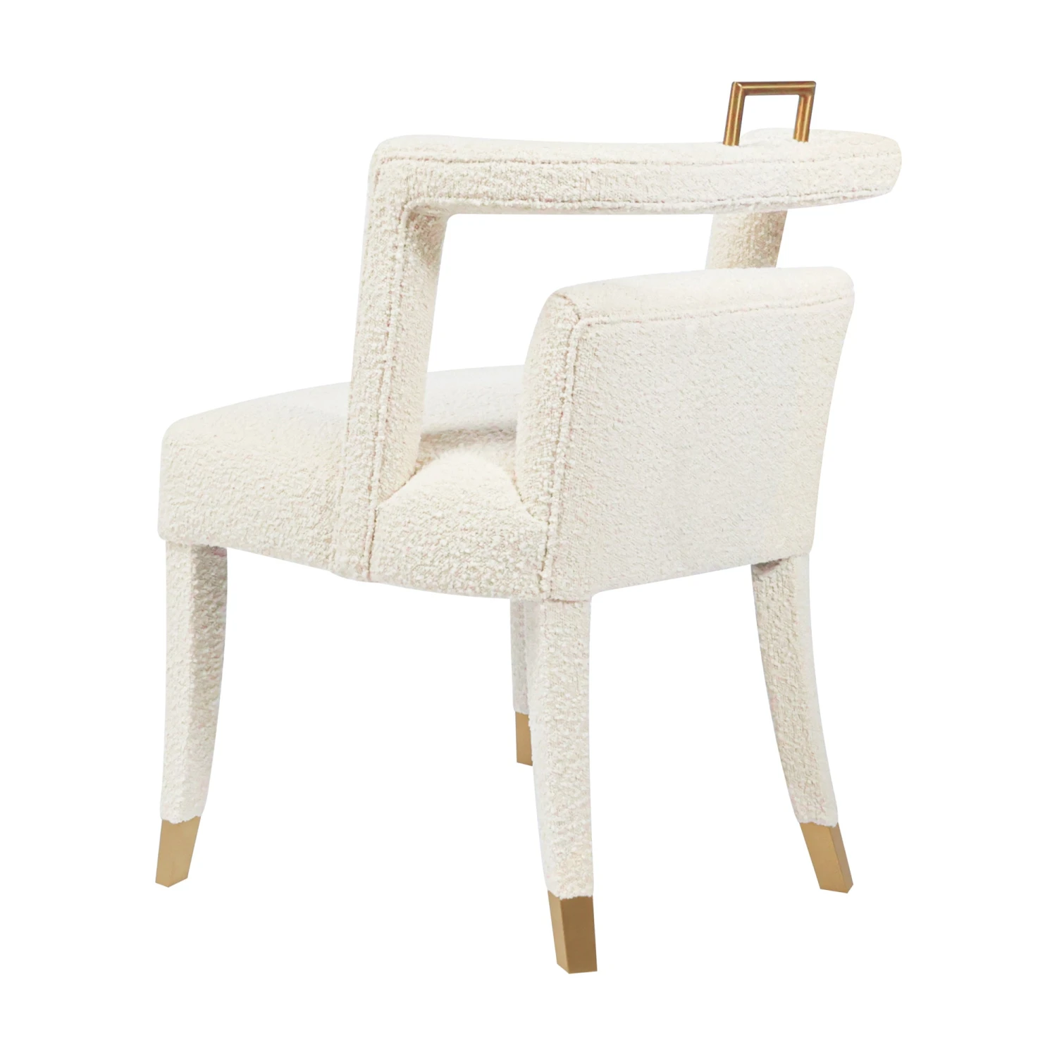 Our Revelryย Dining Chair provides all of the modern interest you want with the softness of ivory boucle fabric. We love the brass accents and unique open back design.ย