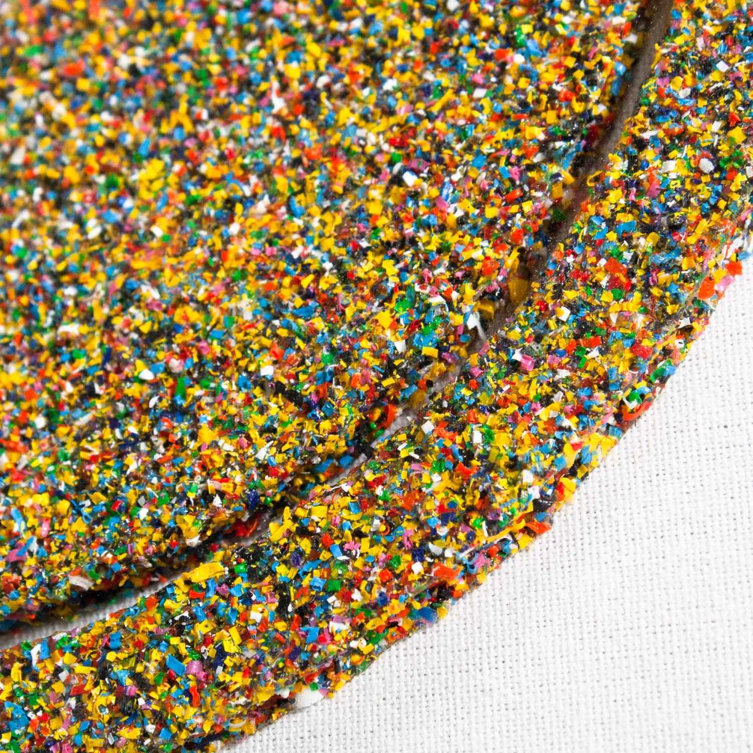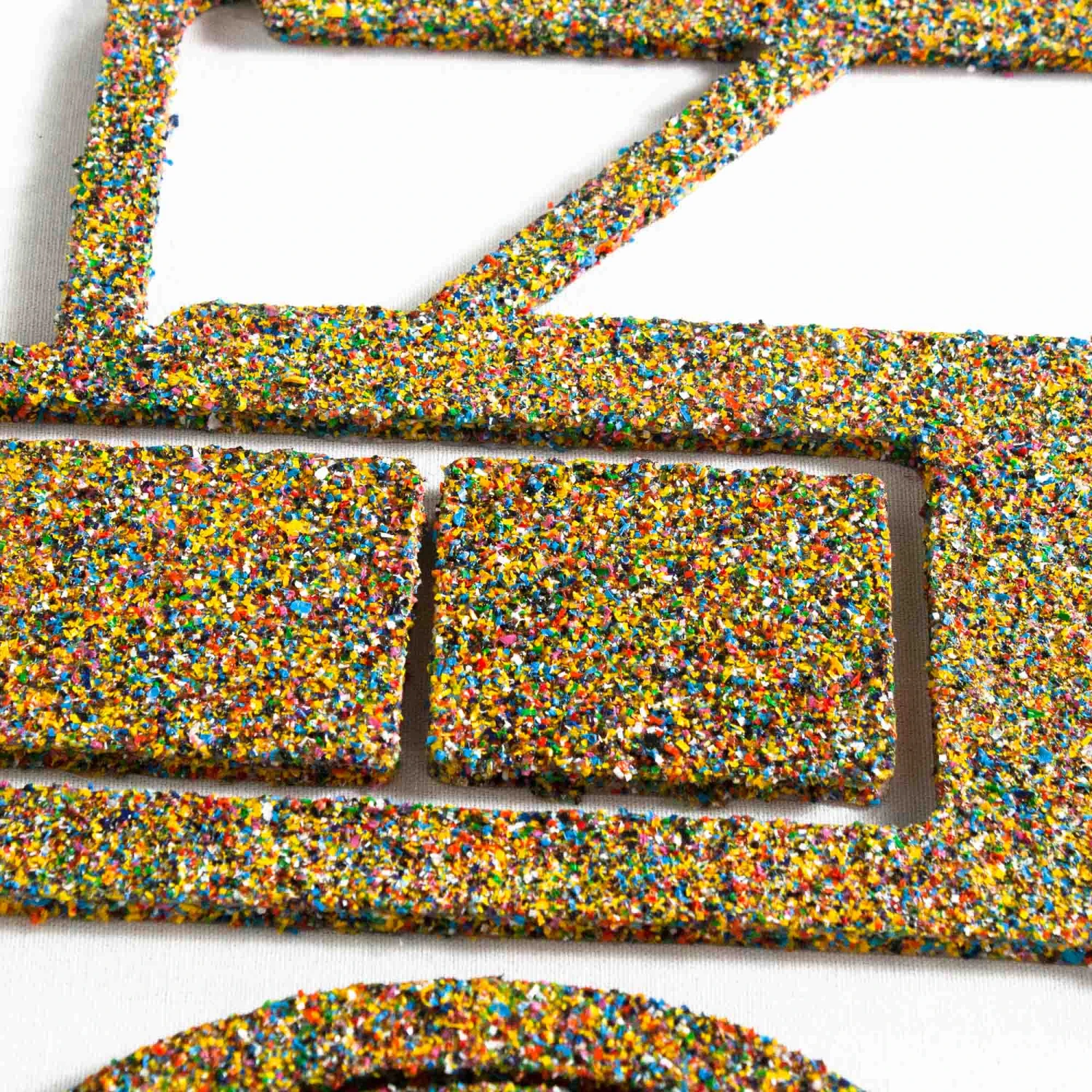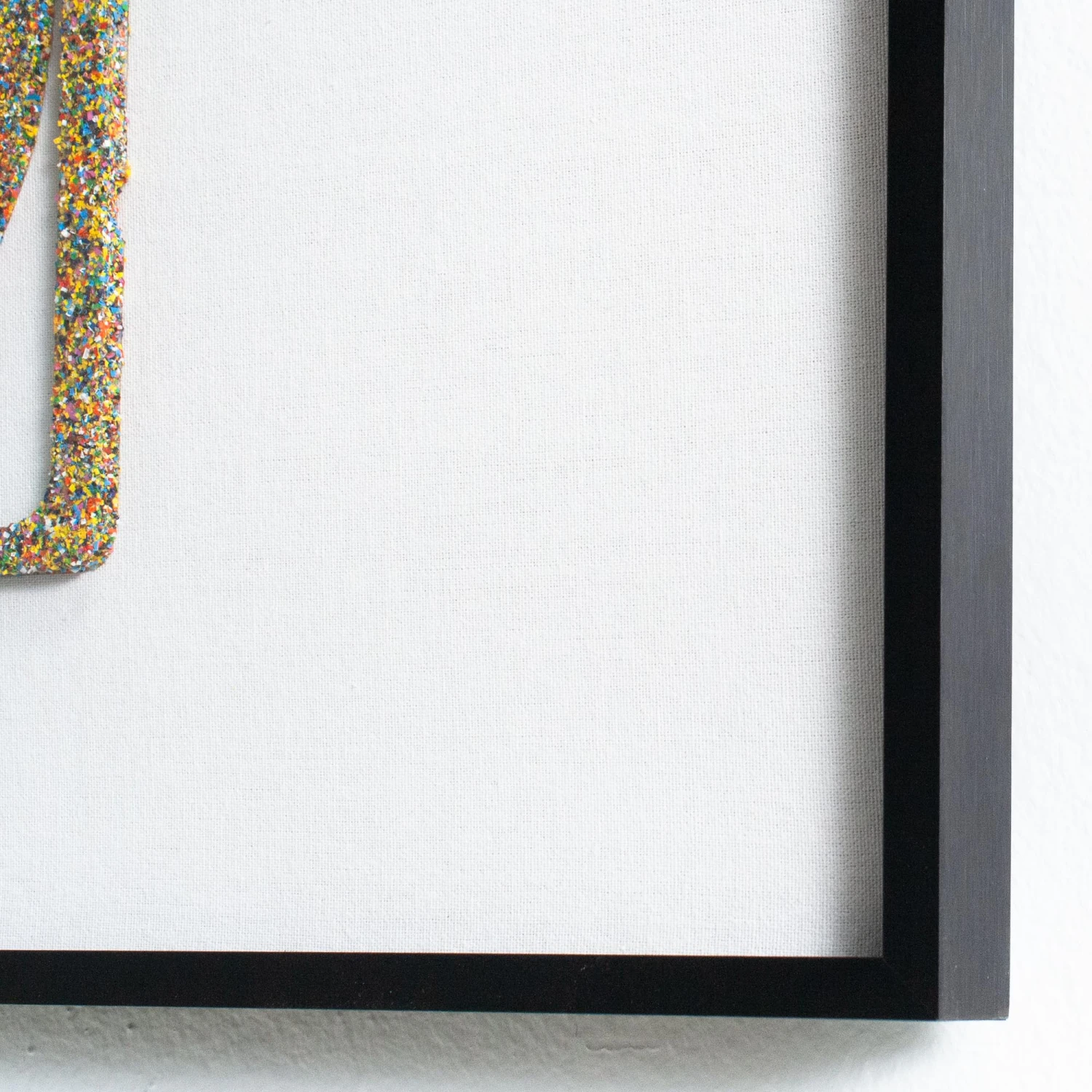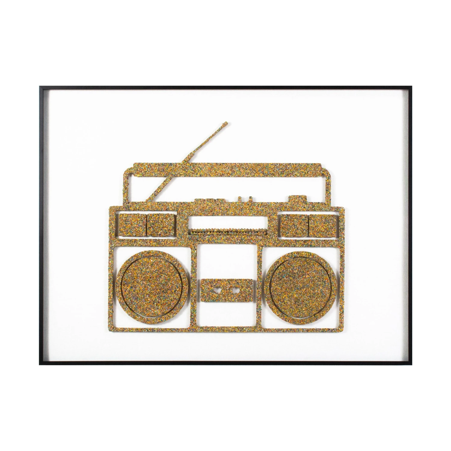 Boombox artwork made of recycled crayons shavings on a white canvas in a black metal frame with a plexiglass panel.ย