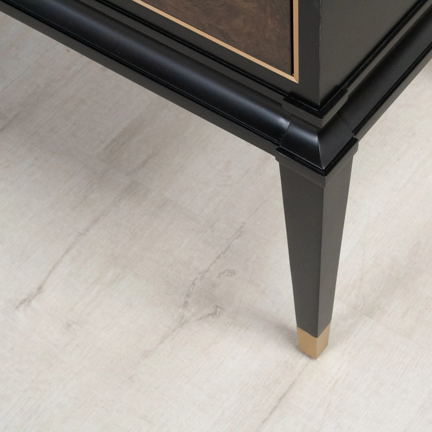 Soniat is one of the pieces that transcends time. Framed in black lacquer, these burl fronted drawers are adorned with brass hardware.