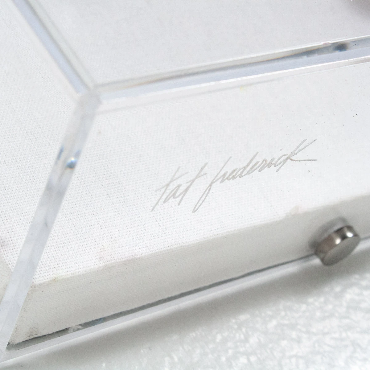 Use a screw driver to pop off the silver caps and unscrew each one that attaches the acrylic box to the canvas. Once all screws are off, you can lift off the acrylic box. Brush out any sprinkles carefully and re-attach the acrylic box to the canvas using the screw driver. Be mindful of fingerprints and use a cloth to remove any marks on the inside of the acrylic before re-attaching the box.