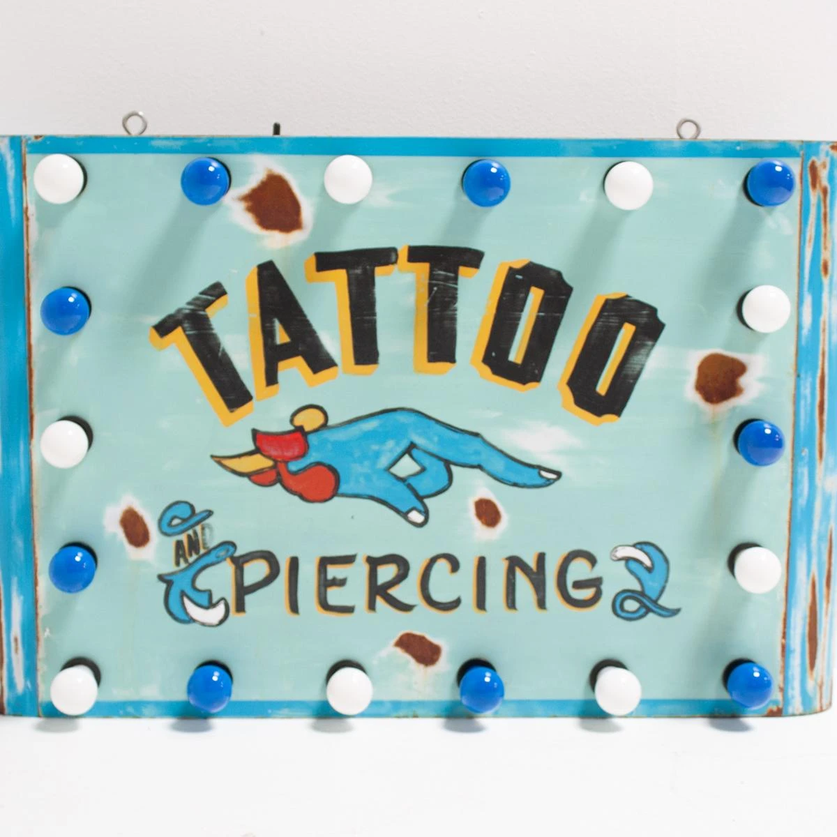 Tattoo Piercing light-up sign, made to look vintage by artist Garland Murphree. Two light settings with one flashing.