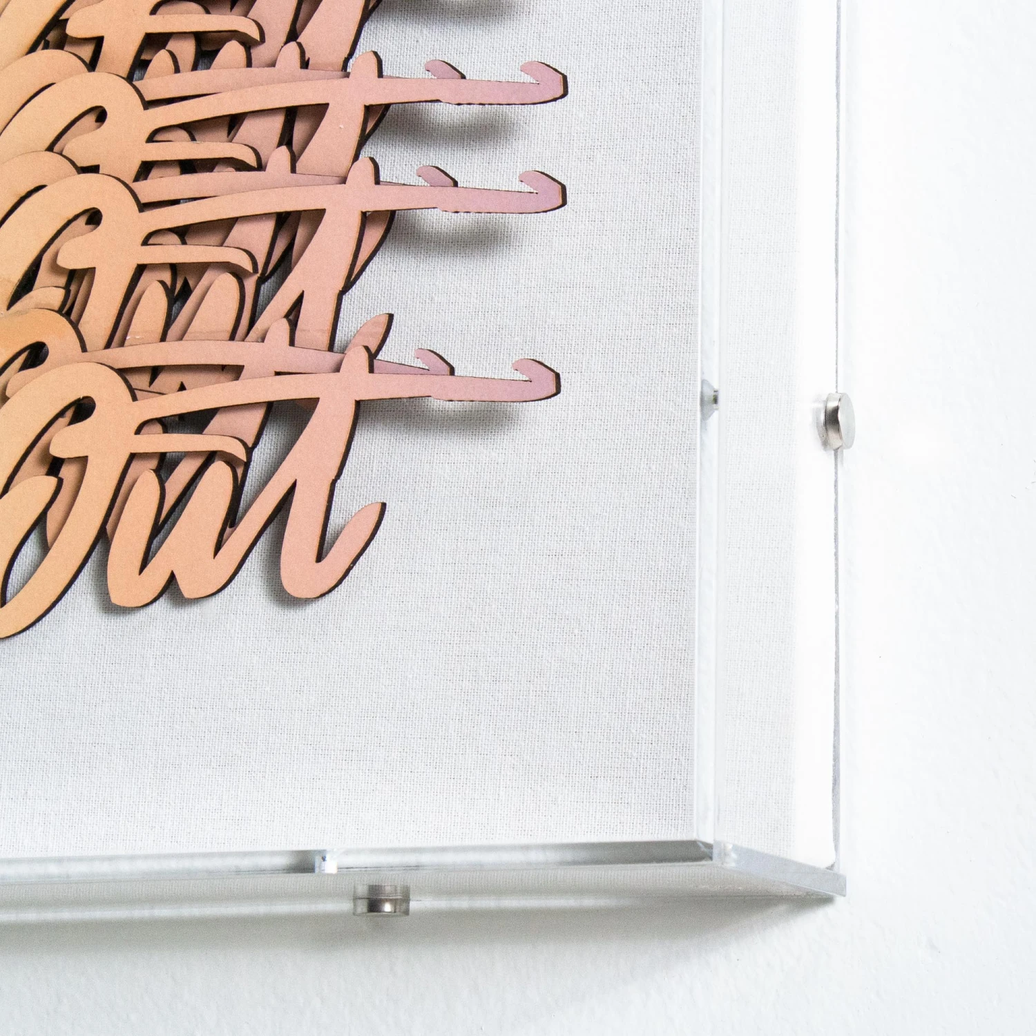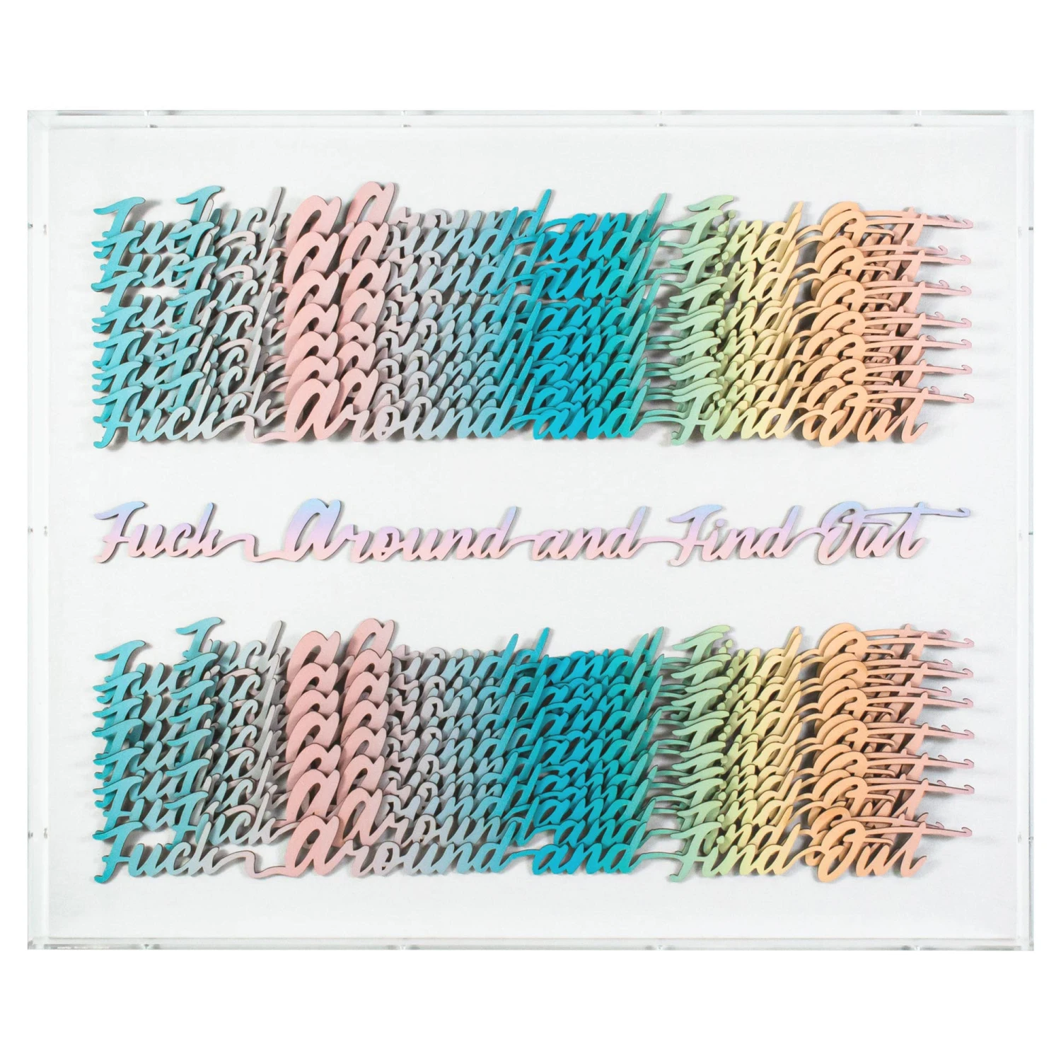 Let’s get weird y’all. Laser cut words “fuck around and find out” individually placed on white canvas and framed in an acrylic shadowbox. Now available in a rainbow ombre colorway for all of the punchy fun.ย