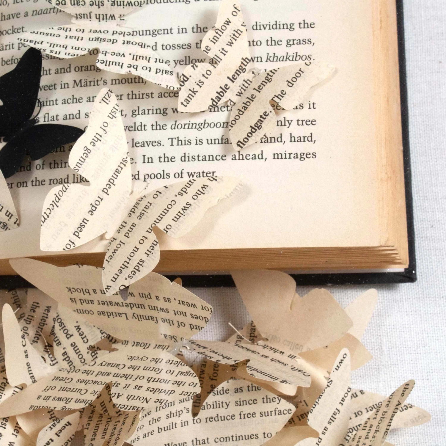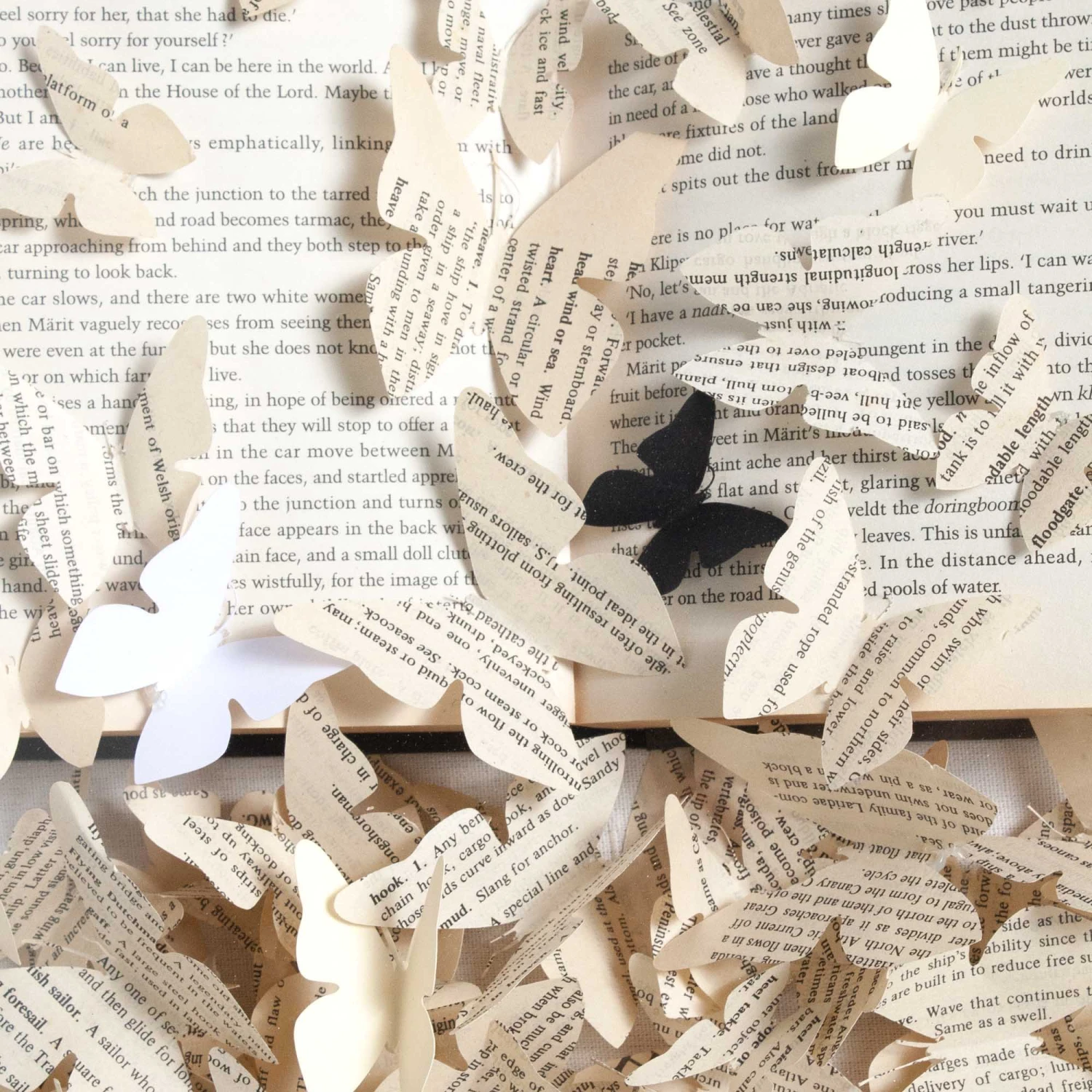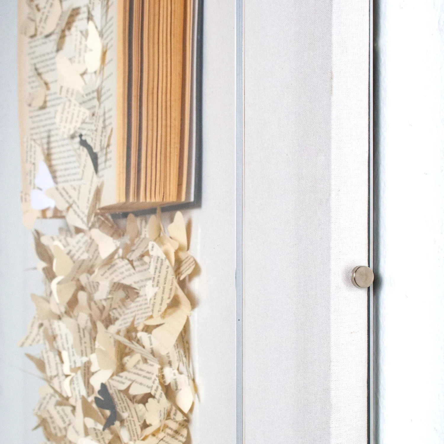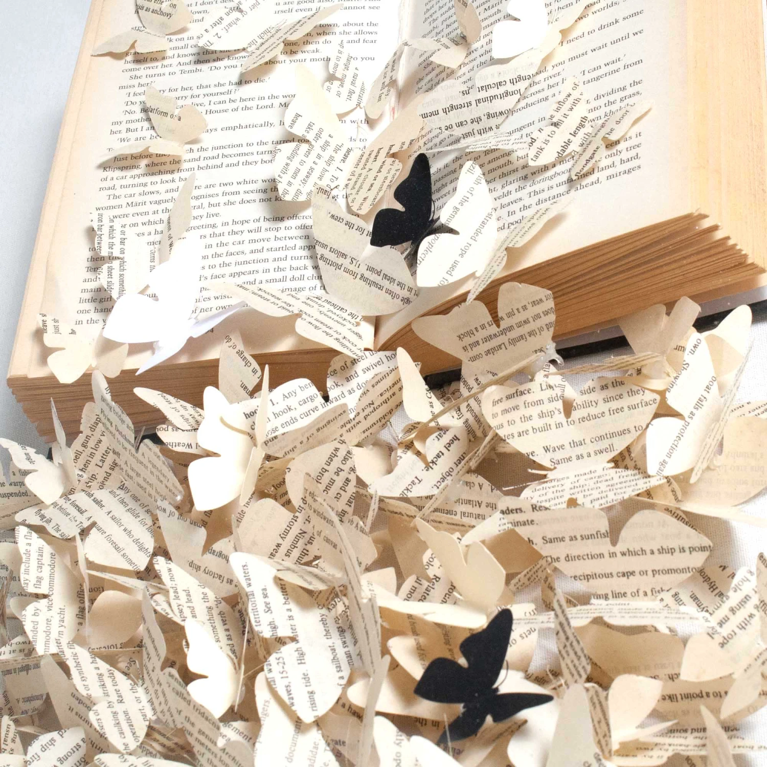An open book is flooded with hand cut butterflies in book pages. Mounted on a white linen canvas and framed in an acrylic shadowbox for an amazing 3D effect.ย