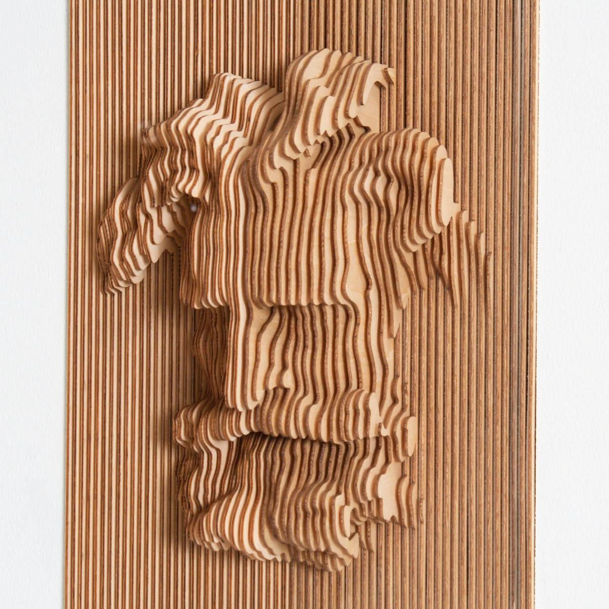 Mixed media artwork by Tat Frederick. Cardboard cutout Roman face with a stunning 3D effect.