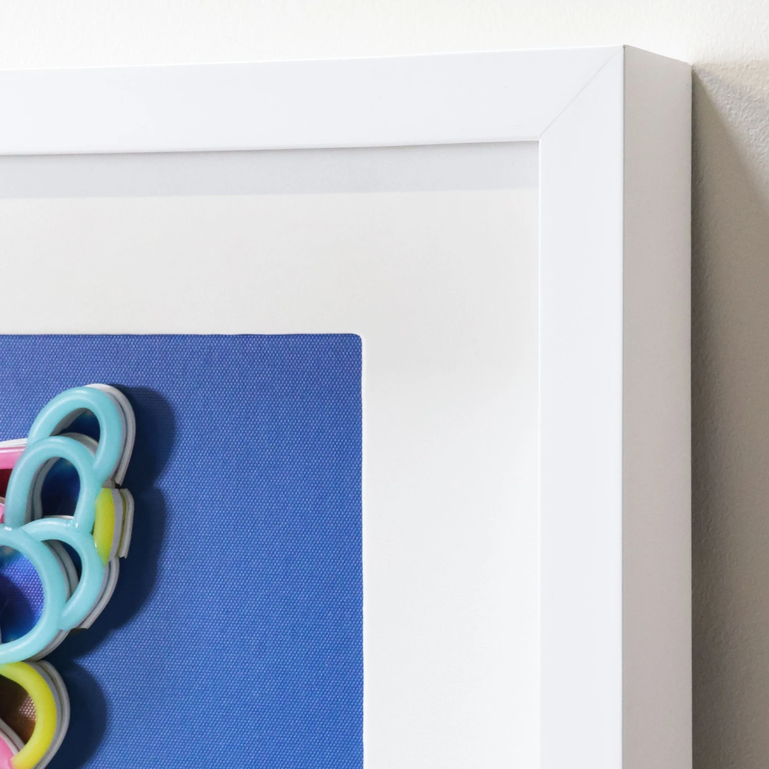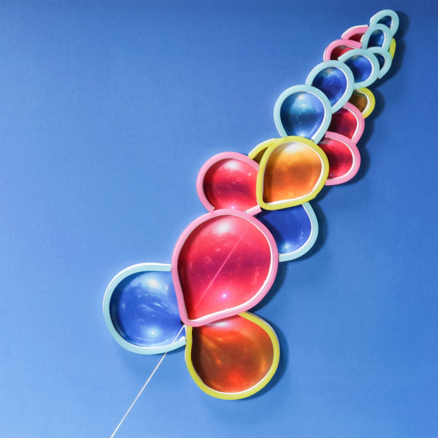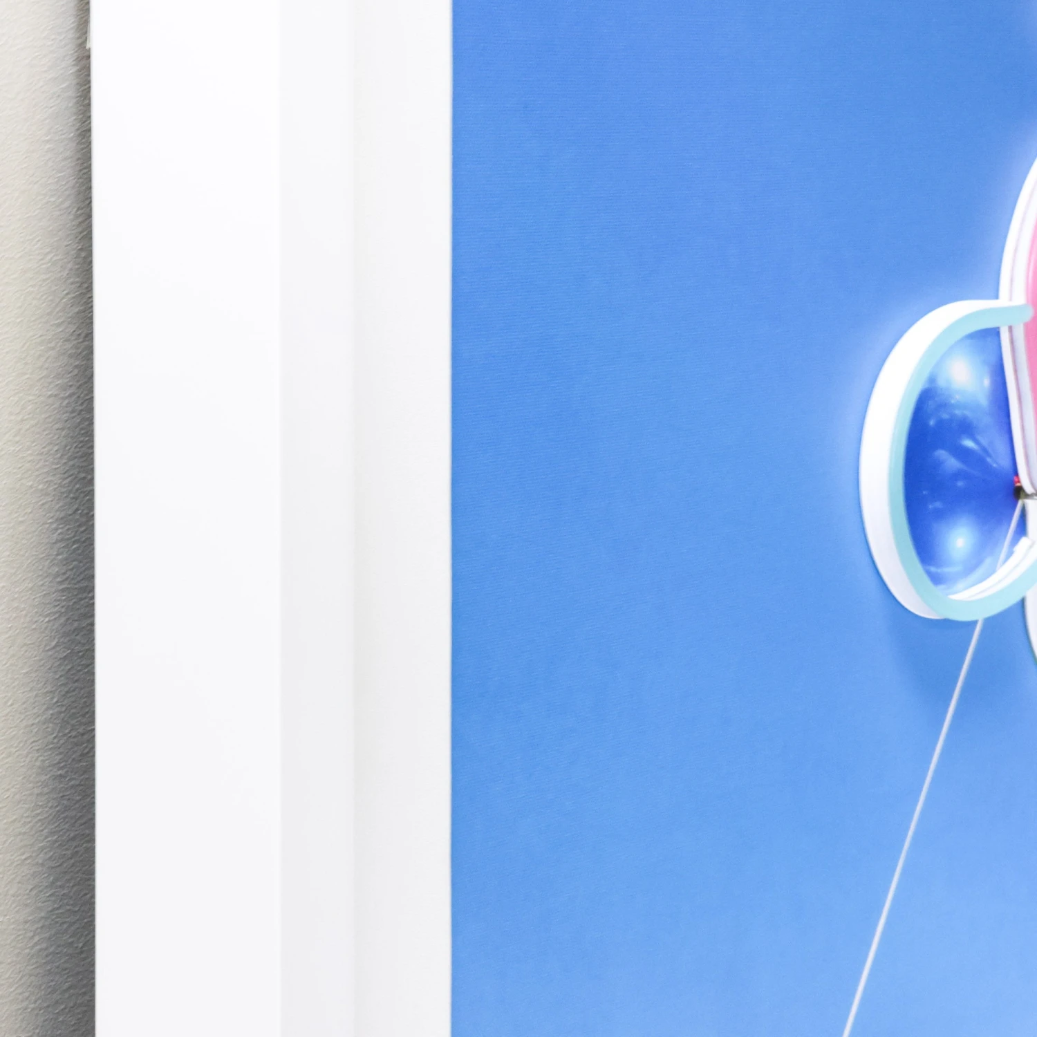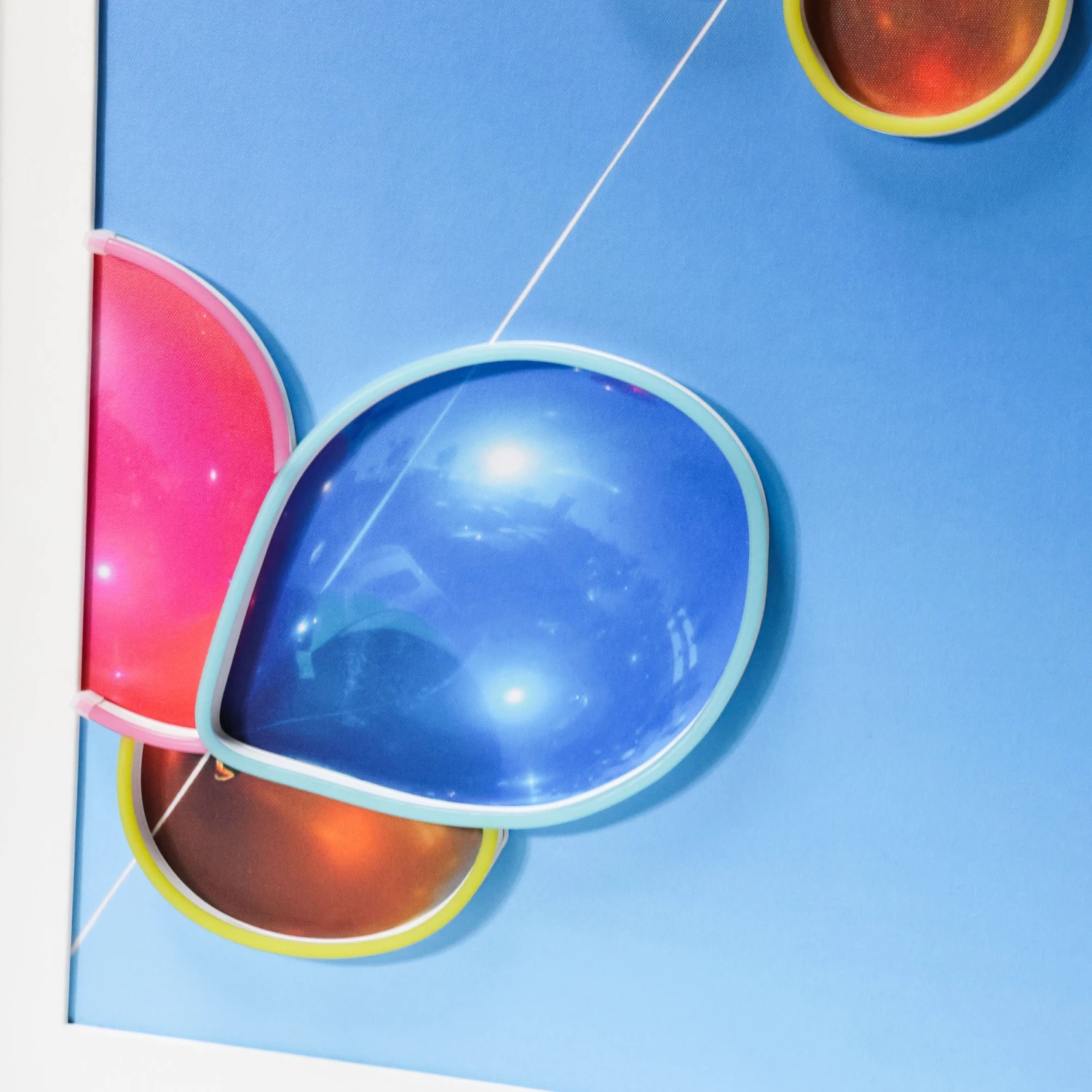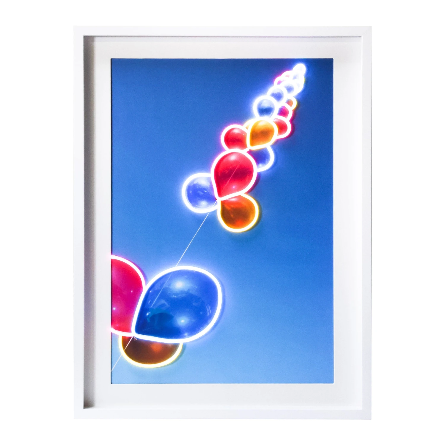 Photography print of multi-colored balloons that are surrounded by multi-hued neon lights. Framed in white.