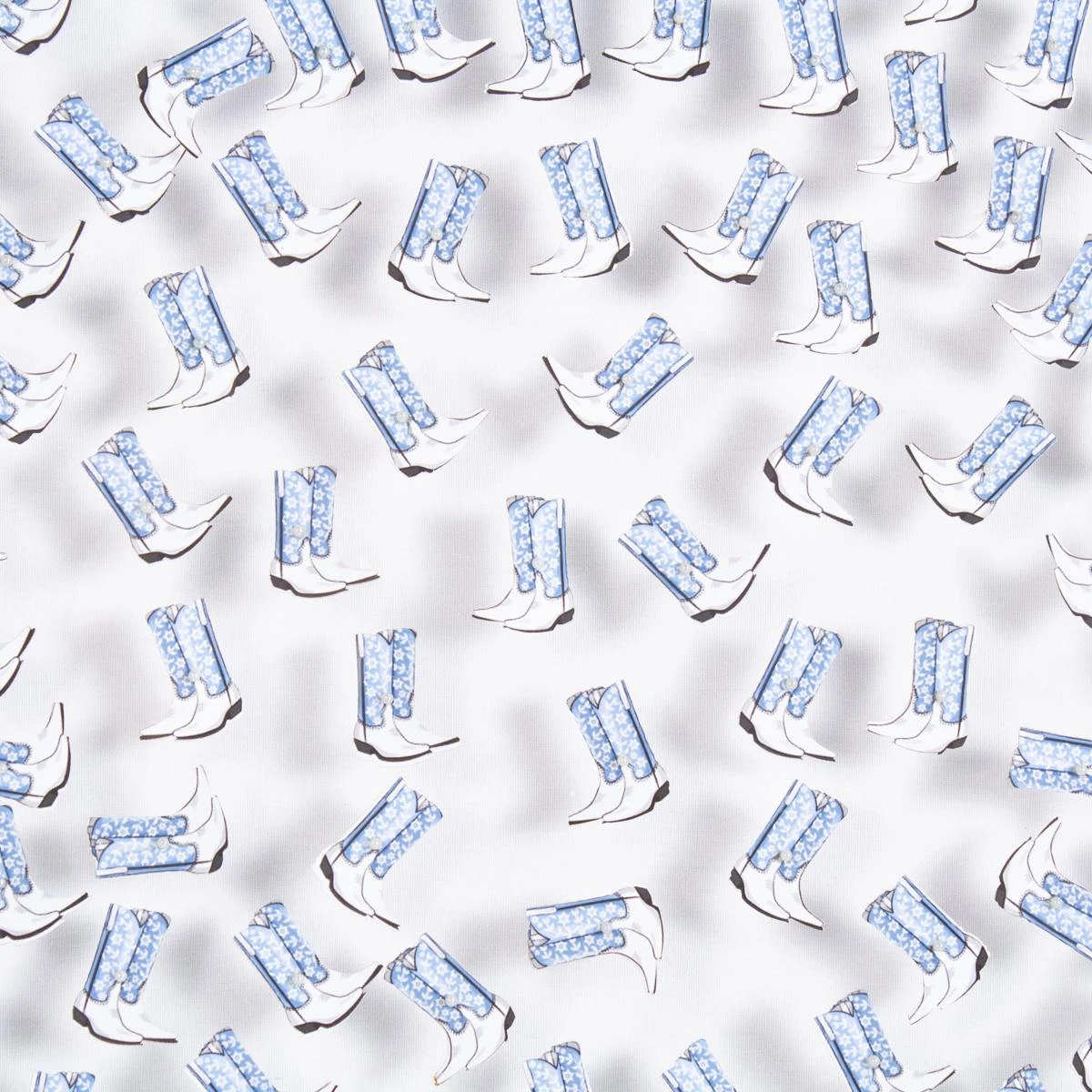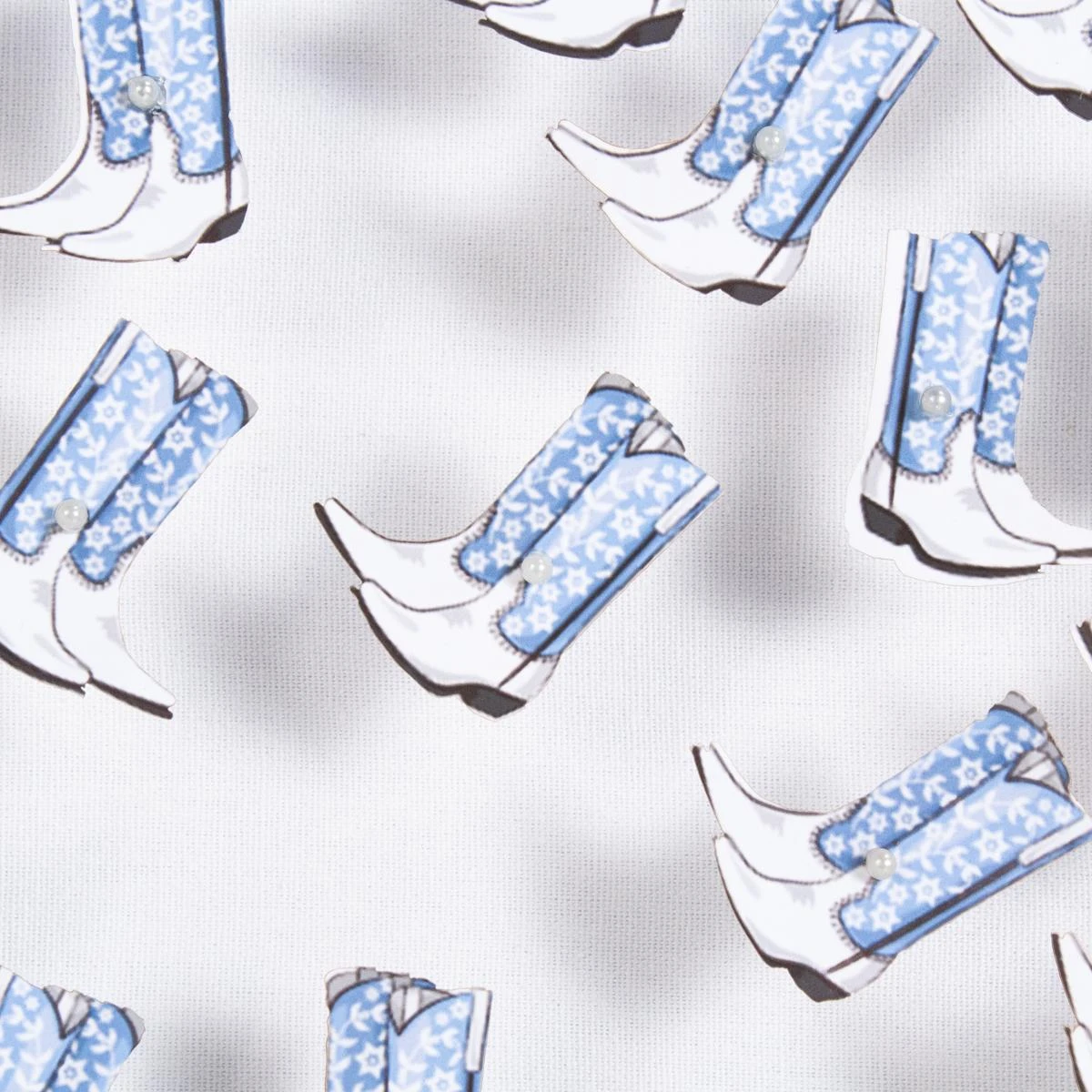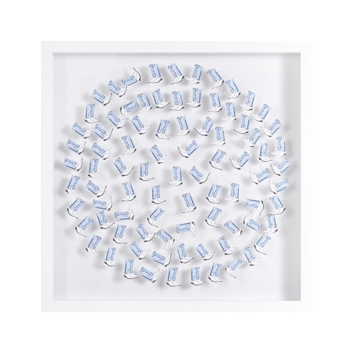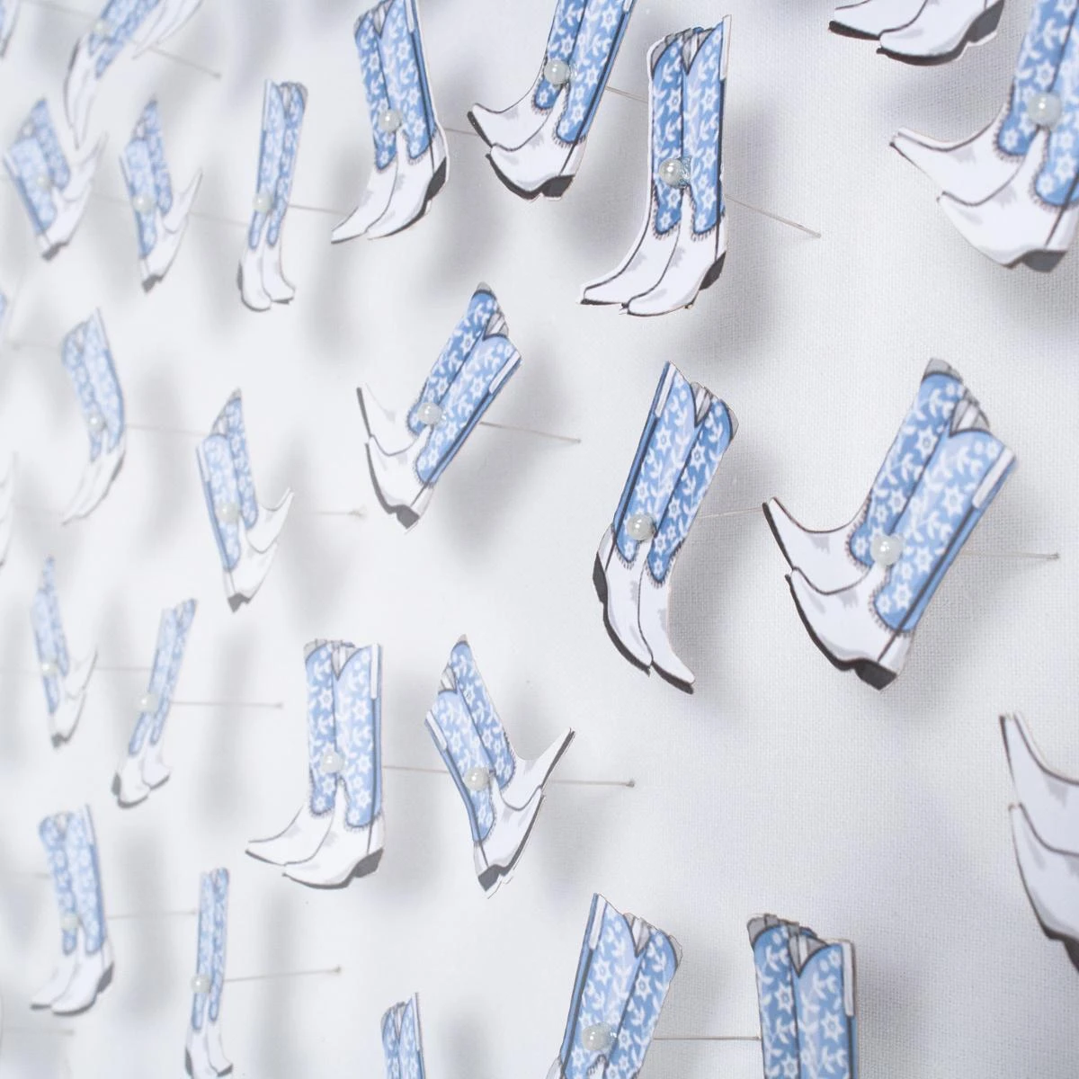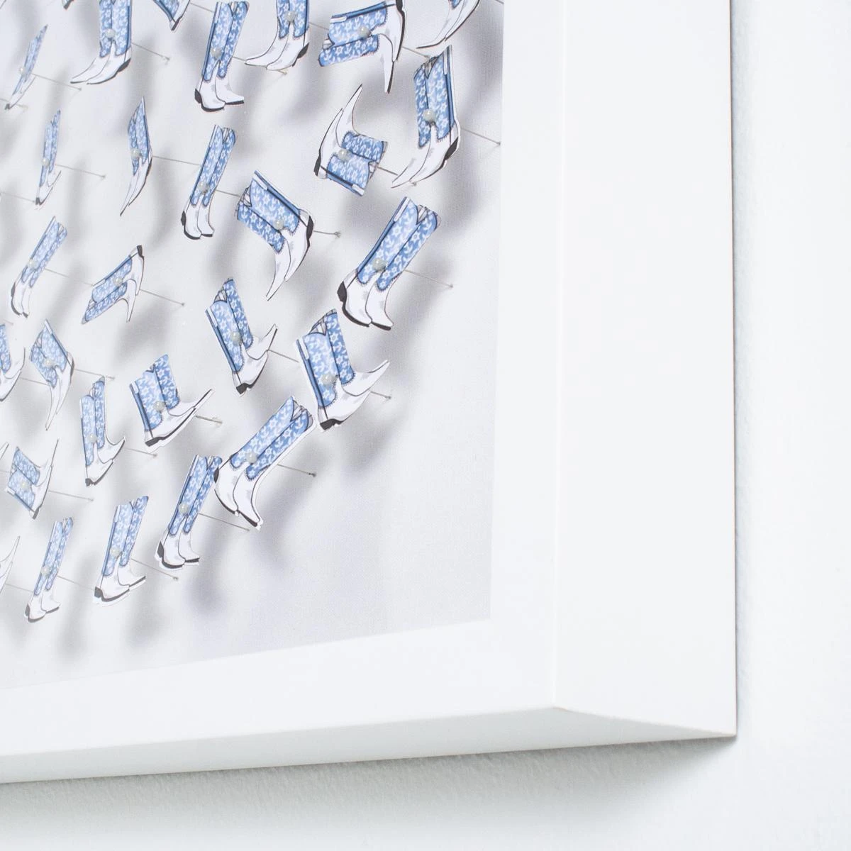 Hand-cut blue and white cowboy boots individually placed on white canvas and framed in a white wood frame.ย Each piece is handmade and slight variations are possible.